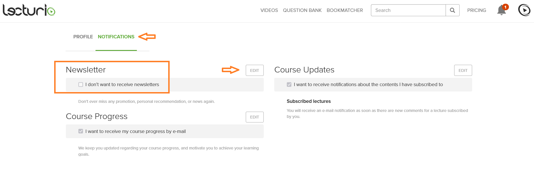 Alternatively, you can also edit the settings of the subscription to our newsletter, learning reminders, and course updates in the section Notifications of your account's personal area.