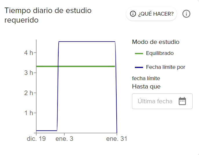 - En el ejemplo, tienes que invertir 3 h 20 min al día para completar la tarea con fecha límite 31 de diciembre y la tarea con fecha límite 31 de enero.