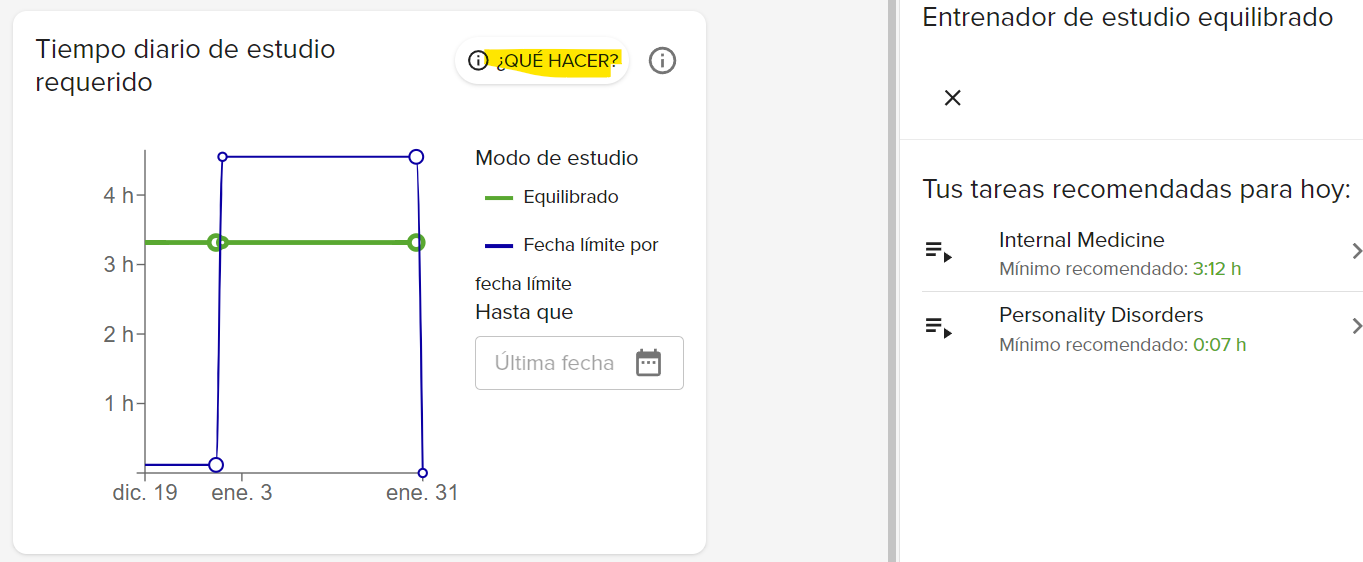El entrenador de estudio equilibrado (que se muestra al lado derecho) te proporciona las tareas que deberías completar hoy para cumplir con tus plazos y lograr tus objetivos a tiempo: